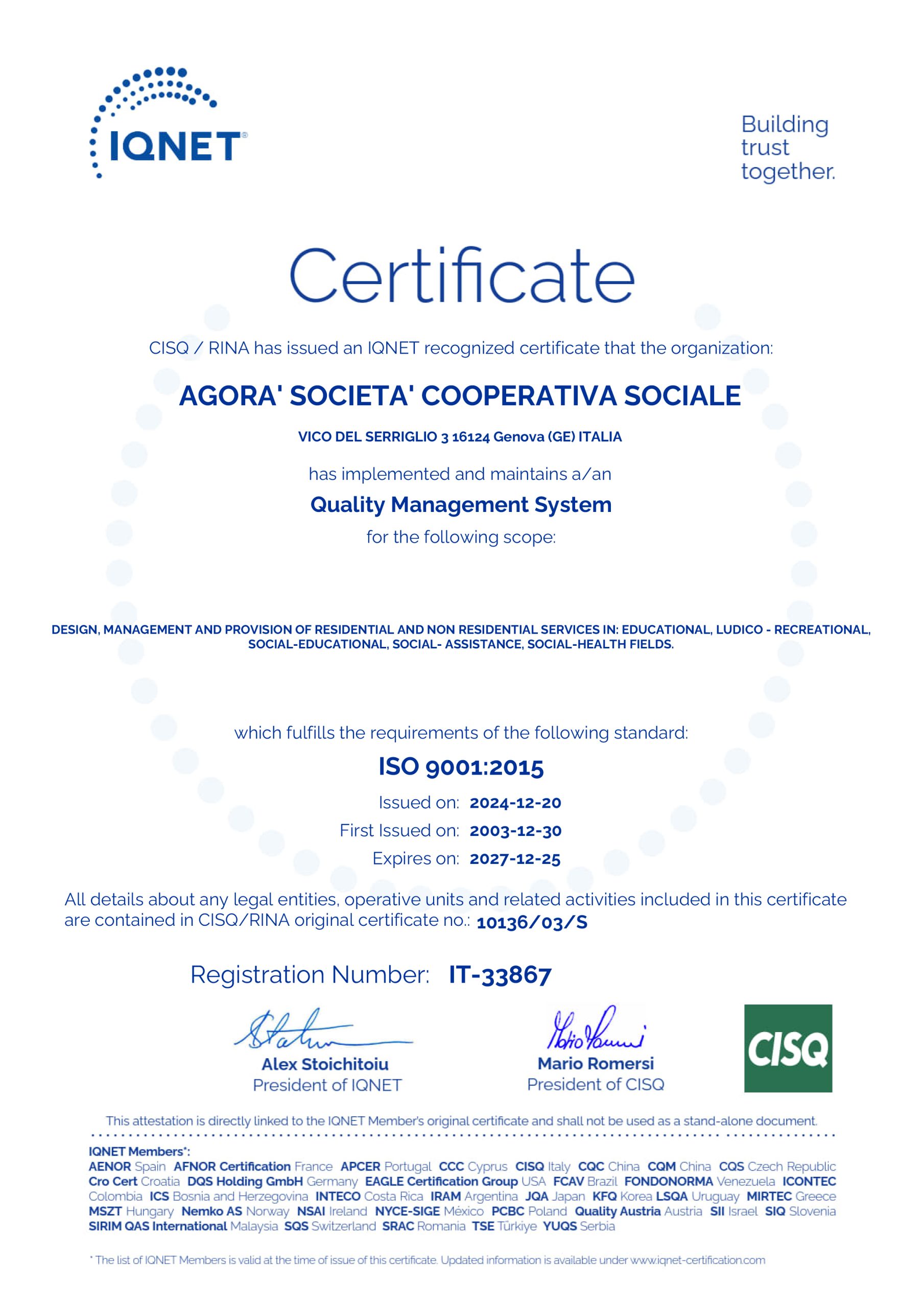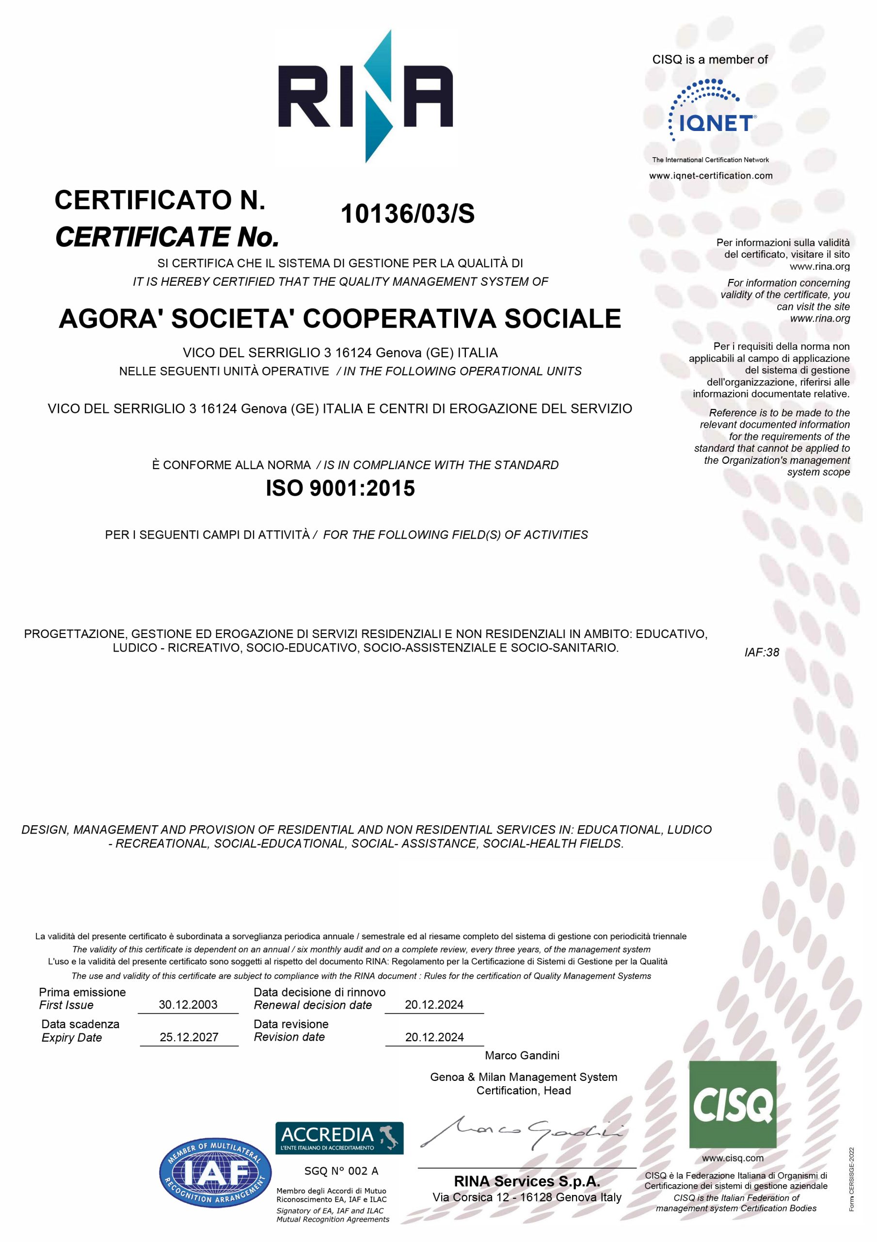 Nel 2024 Agorà ha conseguito il rinnovo delle certificazioni di qualità IQNET e RINA.