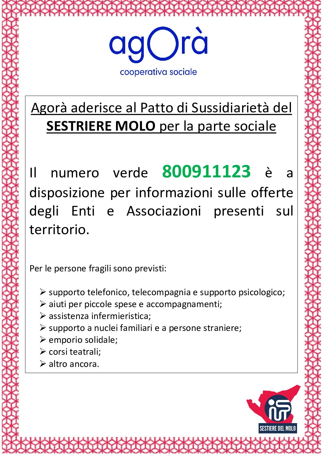 Il PATTO DI SUSSIDIARIETA’ per il SESTIERE DEL MOLO, di cui Agorà fa parte assieme ad altre cinquanta organizzazioni del Terzo settore, si arricchisce di un nuovo strumento per i cittadini: il numero verde per reperire informazioni sulle opportunità presenti sul territorio